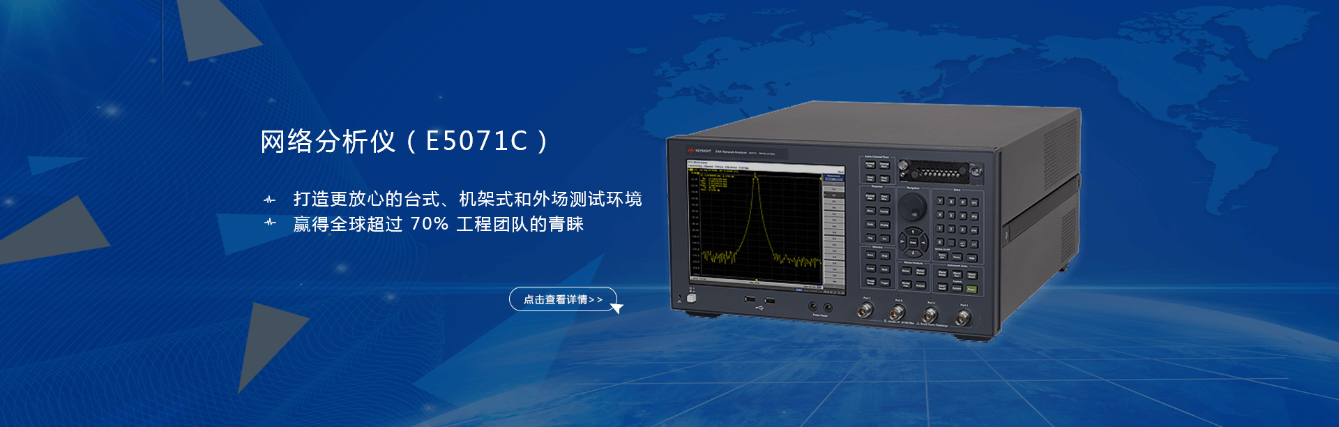 主要產(chǎn)品有:頻譜分析儀,網(wǎng)絡(luò)分析儀,綜合測試儀,藍(lán)牙wifi測試儀,噪聲系數(shù)測試儀,接收機(jī),電話測試儀,高、低頻信號(hào)源,音、視頻信號(hào)分析儀,高精度萬用表, LCR/ 電橋、各種通信電源等。經(jīng)營的儀器品牌主要有:Keysight/Agilent (惠普 / 安捷倫)、 R/S (羅德 & 施瓦茨)、 Anritsu (安立)、Litepoint、 FLUK( 福祿克 ) 、 TEK (泰克)等。